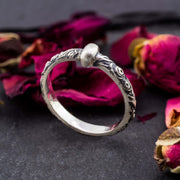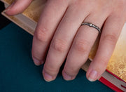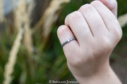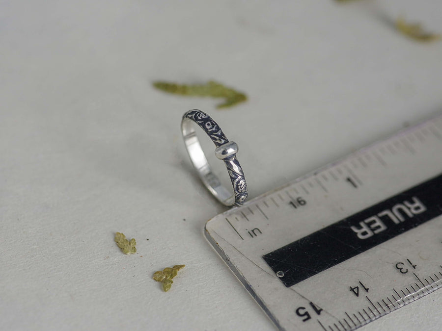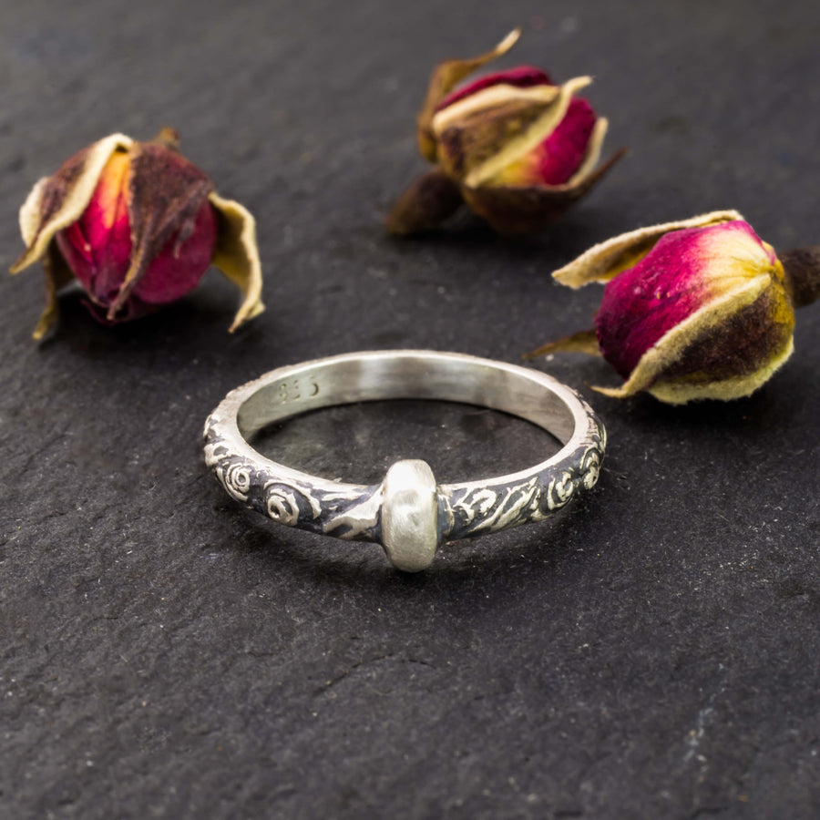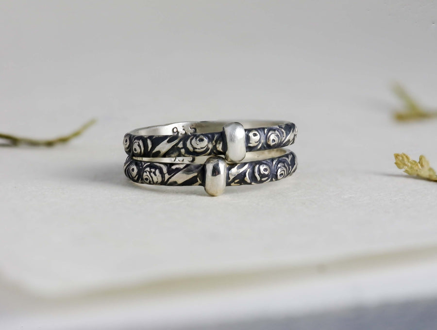 A handcrafted ring made from 935 Argentium Sterling Silver- full of antiqued character, looking like it just stepped out of a blacksmiths shop a few hundred years ago with a bit of floral flair. The band features a continuous rose pattern around the exterior of the band, and is highlighted with a smooth band running down the center- reminiscent & inspired by the term "blade is in the bow." Each of these rings is individually made by hand to your size specifics-just select your ring size from the drop-down box above. This ring makes an excellent promise or anniversary gift for your favorite sassenach or Outlander fan- a great gift for gal pals too. An excellent ring for stacking, gifting or wearing on its own.