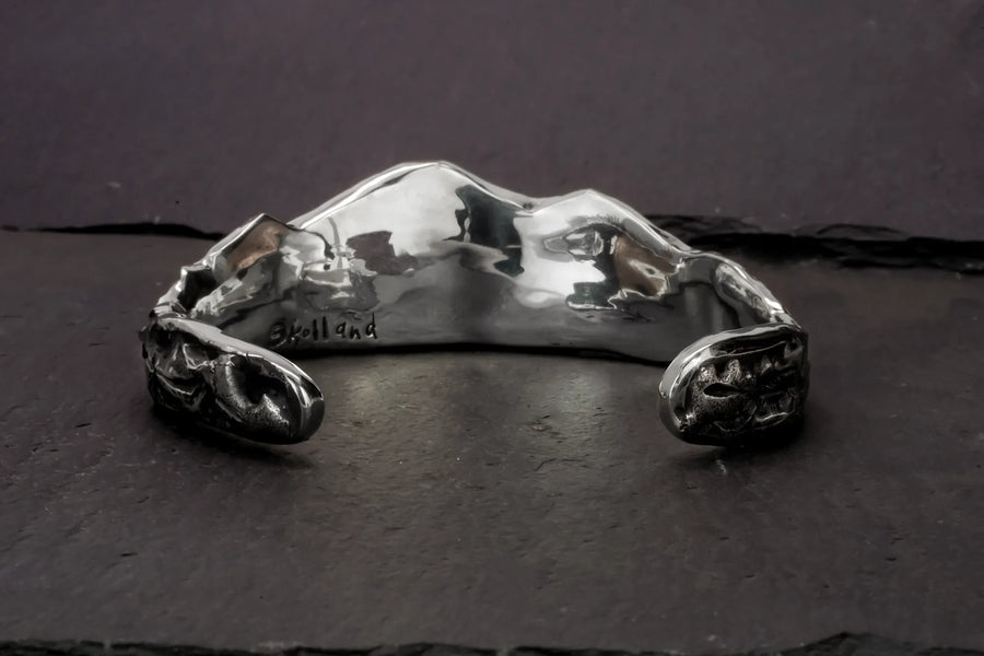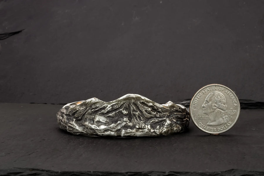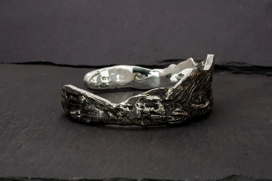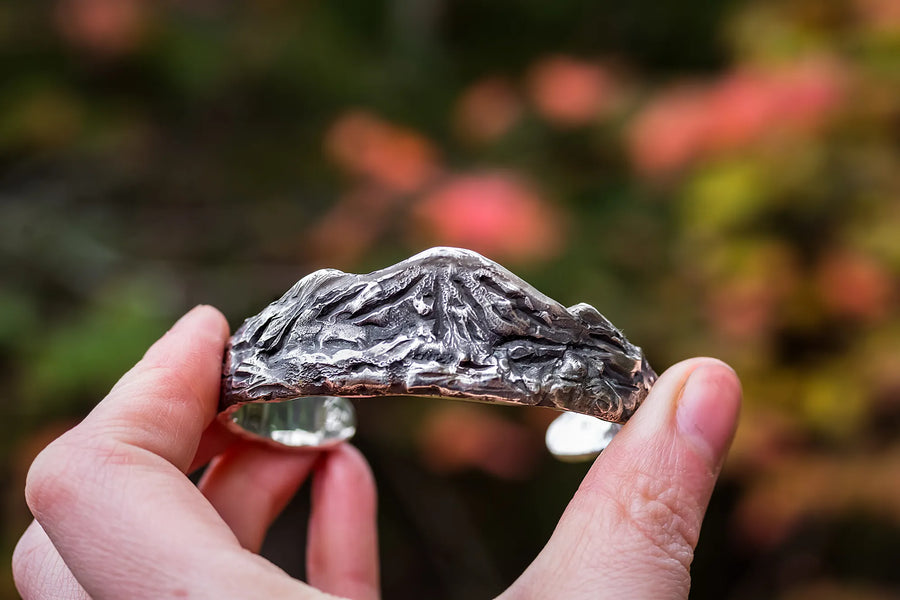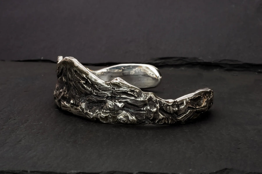 Meet and embrace the rugged beauty of the wilderness with The Ridge Cuff, a sterling silver masterpiece that mirrors majestic mountain ridges. Crafted by hand, and full of texture that mirrors nature, no two cuffs are alike, ensuring this piece is as unique as you. Wear it your way; with peaks cascading towards your fingertips or ascending your arm—it's comfortable, versatile, and undeniably striking. Join an exclusive circle with this rare one-of-a-kind design tailored to your wrist.