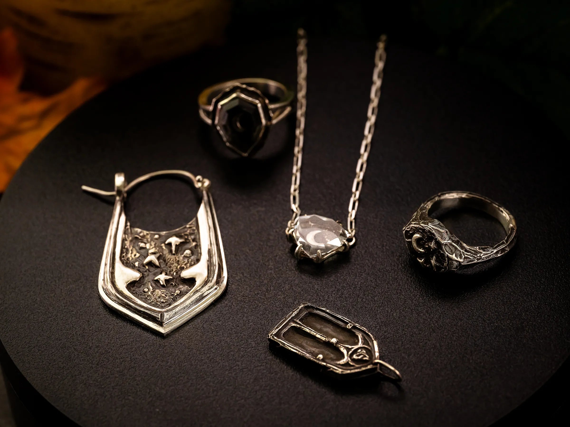 Forge your own legend with these sterling silver and gold cosmic jewels-each piece is handcrafted and designed to channel both celestial wonder and gothic prowess. From sleek cathedral shadow bands to bold architectural-inspired statement rings, these versatile pieces work beautifully alone or layered together, letting you create a signature look that can pivot seamlessly from the office, to the renaissance fair, and on to your everyday adventures.